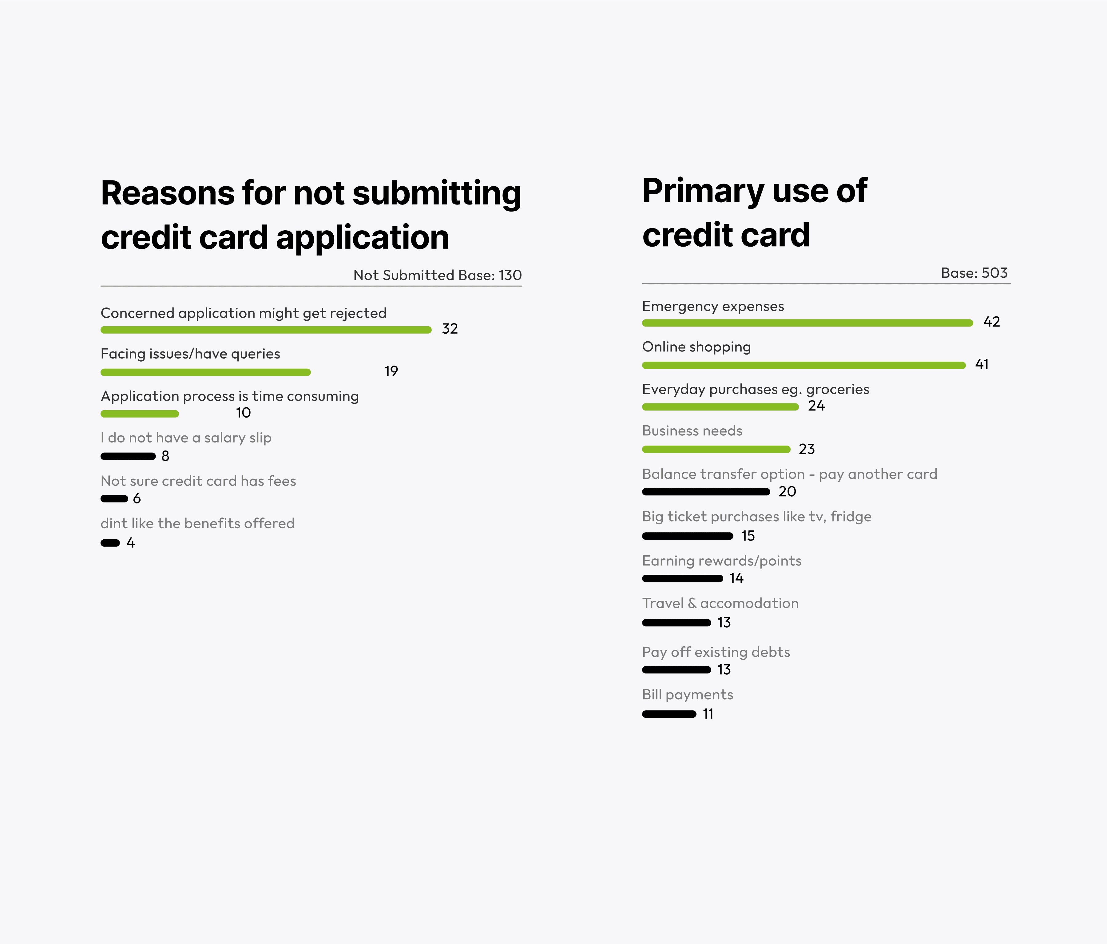 Primary motivations emerged clearly: online shopping (63%), emergency expenses (62%), and major purchases (55%). Application abandonment stemmed from rejection anxiety (105 users) and process complexity (59 users).