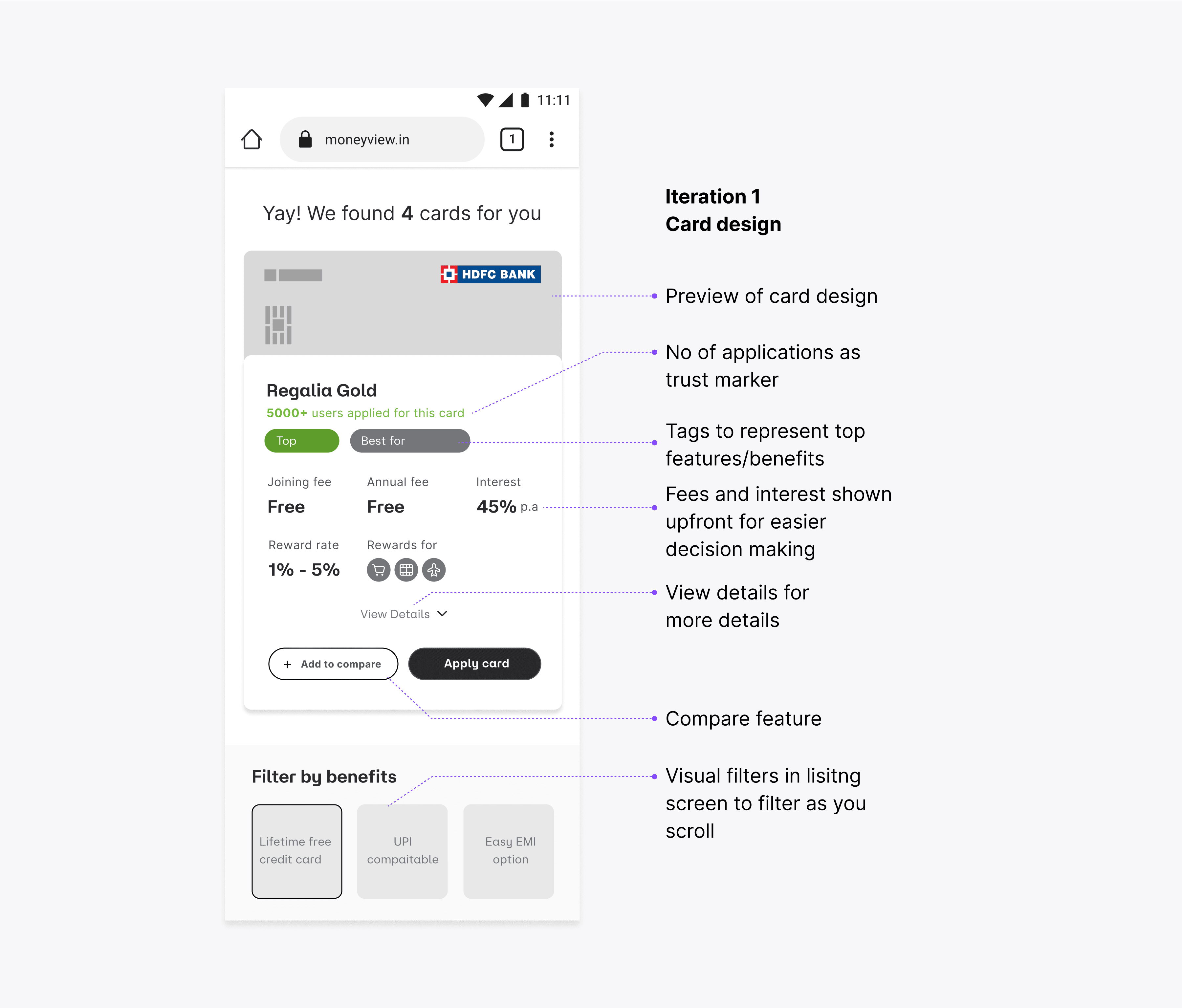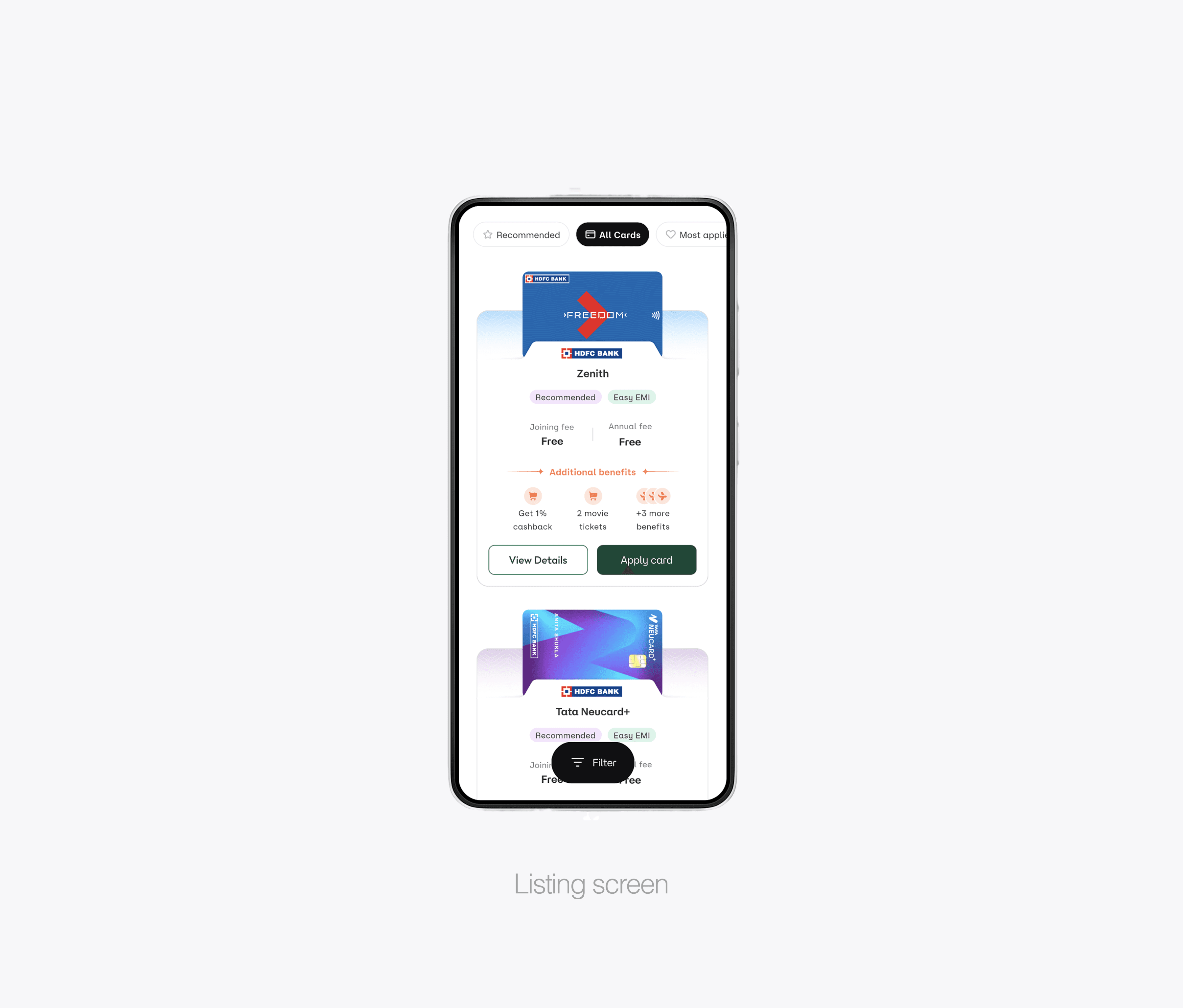 Our approach placed card comparison and filtering at the forefront, ensuring users could explore options with confidence and clarity.